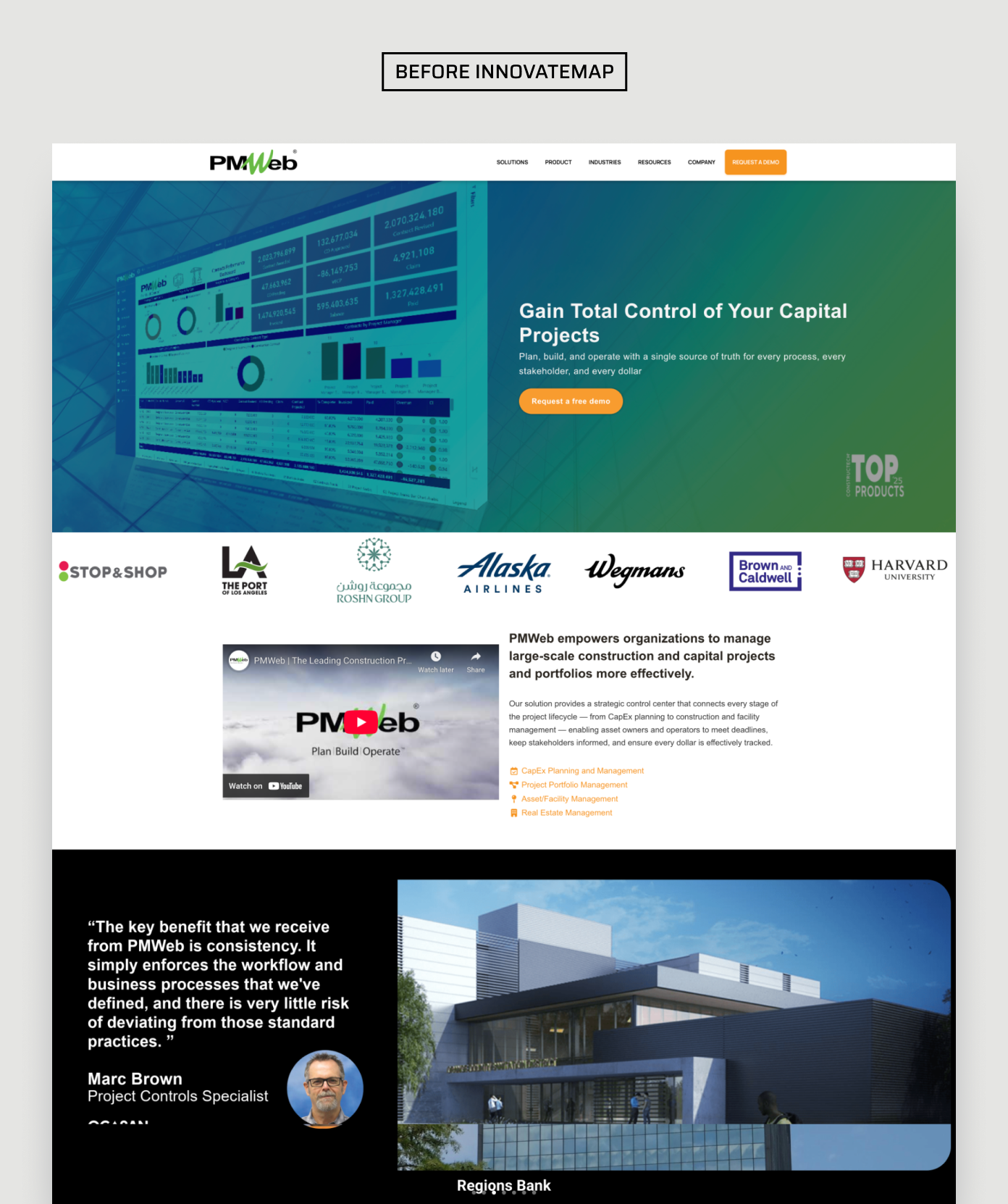 PMWEB equips owner-operators with a strategic control center for managing capital projects from planning to operations. With a proven platform and decades of success, the company set out to evolve its brand and product experience to reflect the scale, sophistication, and confidence of its market leadership. Innovatemap partnered with PMWEB to help amplify that strength—elevating how the company shows up and stands out in a competitive market.